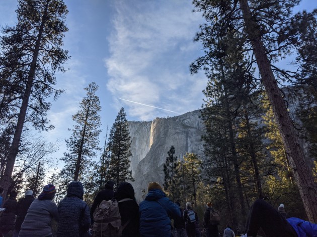 On that day, the traffic was smooth, there were no lines at the entrance, and we did not have problems finding parking space. The park was neither quiet nor crowded. People followed the social distancing protocol and had masks. A 45-minute stroll took us to the horsetail fall. People were chatting within their group. There was quite a bit of snow along the way, which gave us hope that the waterfall has enough water to reflect the sunset. When we got to the vista point, there were already hundreds of people waiting. We barely found a spot to fit in our two low-back chairs, while maintaining some social distance with others. With our beanie, gloves, and ski jacket, there was time before sunset for books, snacks and pictures. We could hear people reminiscing about their firefall watching experiences in different years. After over an hour of waiting in the cold, the photographers started fidgeting their cameras, the amateurs were staring, with undivided attention, at the El Capitan horsetail fall. We could feel the ambience changing and it was quiet. The sunset lasted about 15 minutes, as the angle of the light changed, the firefall and its mist had a different look all the time. There were “a”s and “o”s It felt a bit like watching the fireworks in the crowd. It was spectacular and totally worth it. The pandemic has made this all the more unique. The firefall is like a scene out of the world.