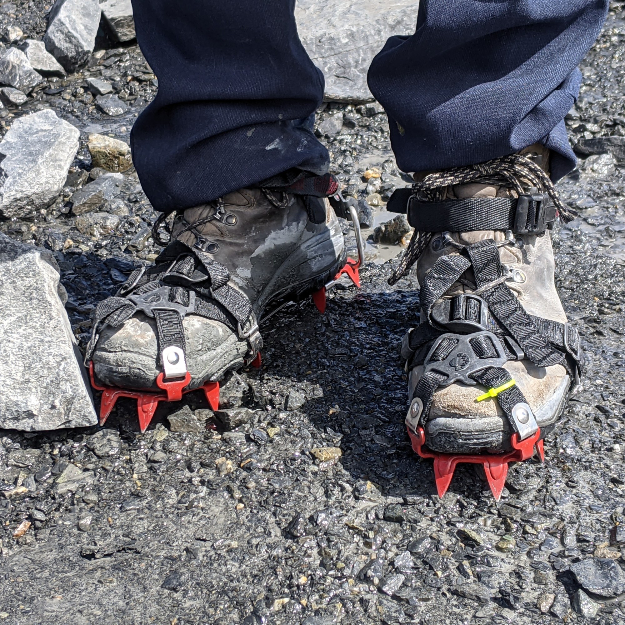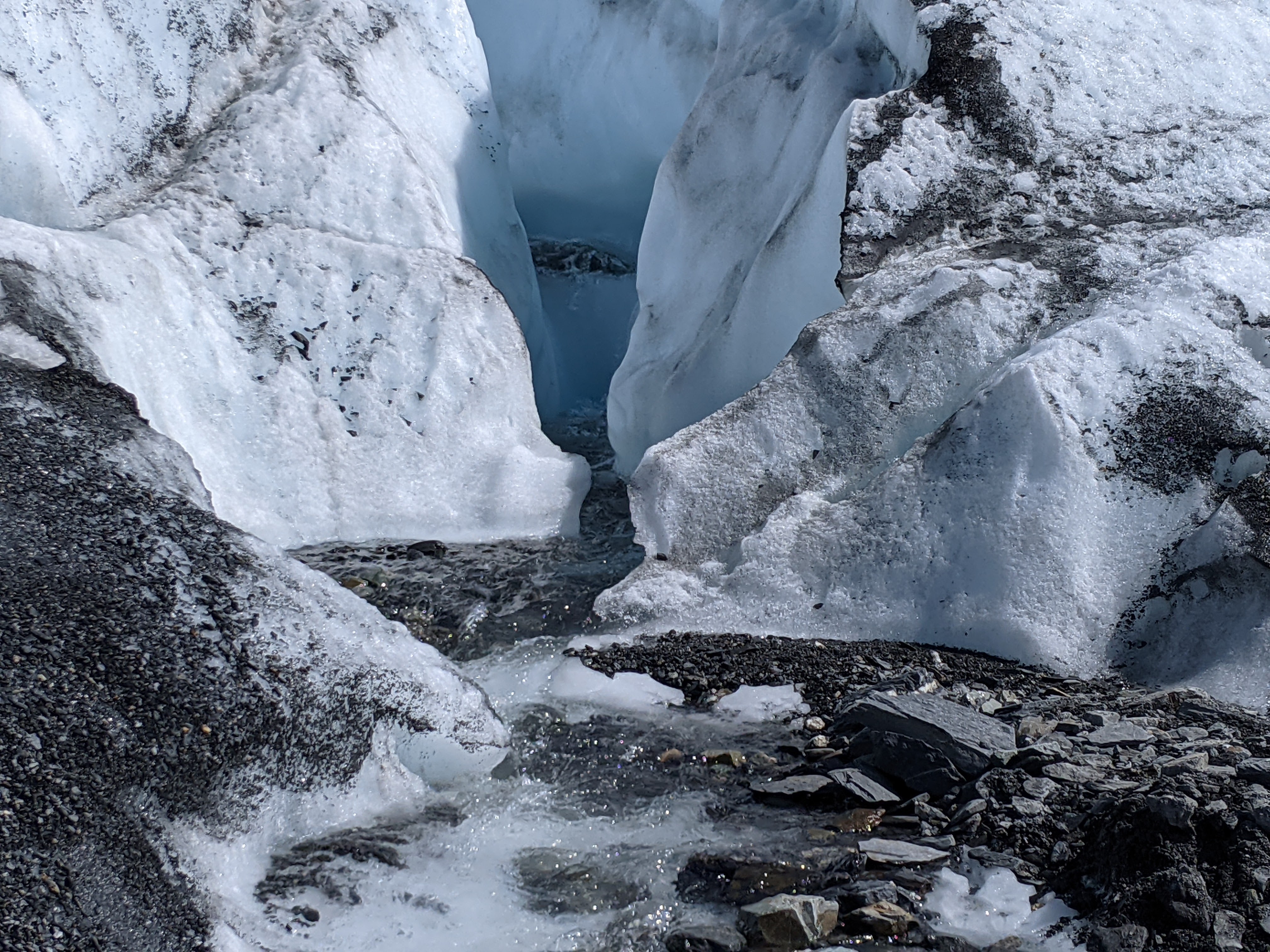 We put on full gear including a hard hat, a well-worn hiking boot from the tour company, and carried a pair of clamping shoes. The tour guides were two young women, both flying in to work during the summer months. They told us that the glacier has been receding very quickly. What surprised us more though was that the glacier started with the “muddy” soil that we stood on; when one of them threw a rock into a narrow muddy poodle, we did not hear the rock landing, that was enough for us not to dip our hiking boots into any of the poodles or crevices through the tour. This was not a good idea to bring small kids who walked to dip into every poodle they saw. We did our own facial mask with the muddy glacier soil, it was very cooling and we took a bag of it home at the end ;).