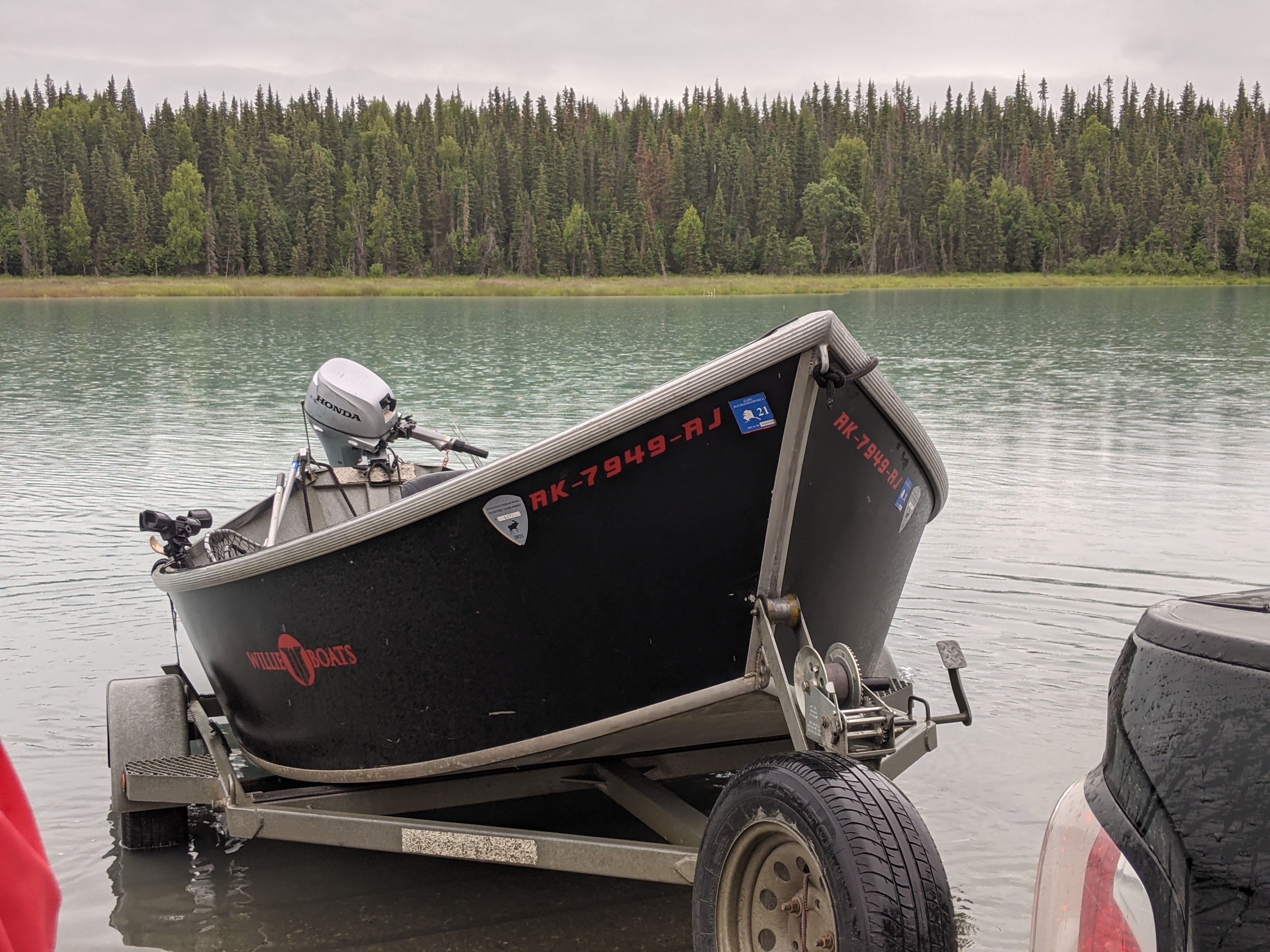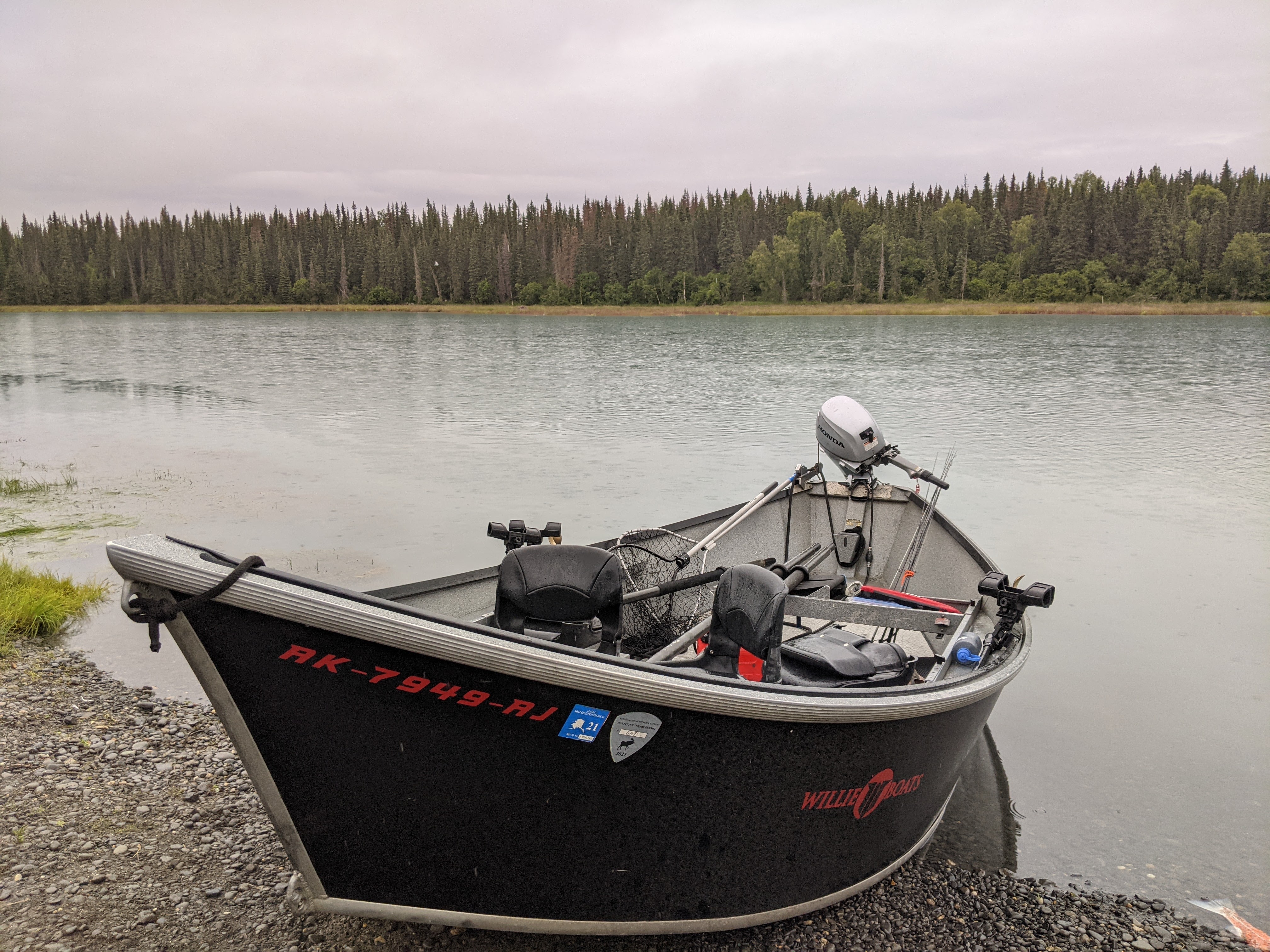 Our fishing guide was a strong man. He came and picked us up in a black truck and a trailer carrying the fishing boat. It was a cool day, with intermittent showers. We were in our T-shirts when we hiked up the glaciers of Harding Icefield, so we felt that a few layers of clothing should be more than enough for the fishing outings. The guide pretty much asked us to put on everything we had. As such, I had my sport pants then ski pants on top before adding the fishing pants that the guide provided . The fishing pants came with a boot, a bit like a wetsuit, and on top of that, we put on the water-resistant hiking boots. Then two layers of Uniqlo down jackets before adding the rain gear. I thought that would have been enough even to watch Aurora! It was until we were on the fishing boat, drifting through the fast-moving Kasilof river with the rain on our face, to fully appreciate the protection of layers and layers of clothing.
