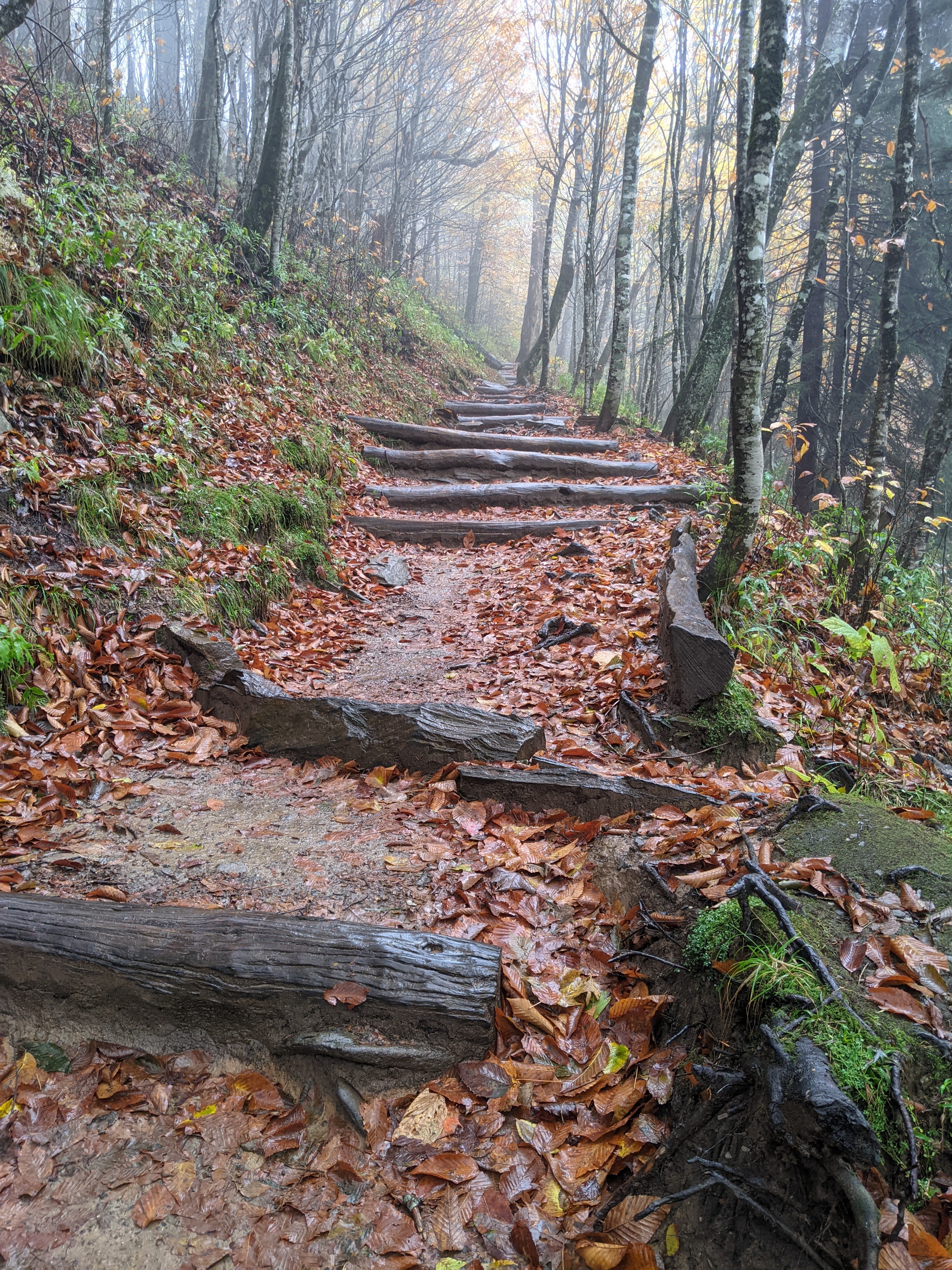 The sunny weather seemed to come to an end. It was chilly and overcast as when we hiked up the Mt Mitchell observation deck. On our way up the hundreds of steps to the Chimney Rock, the rain poured down on our rain gear. We could hardly see any view from the top, but within fifteen minutes, it cleared up a bit to allow us to take some photos. The Chimney Rock has a cool setup to allow us to either walk up or take an elevator. With the weather, we took the elevator down.
