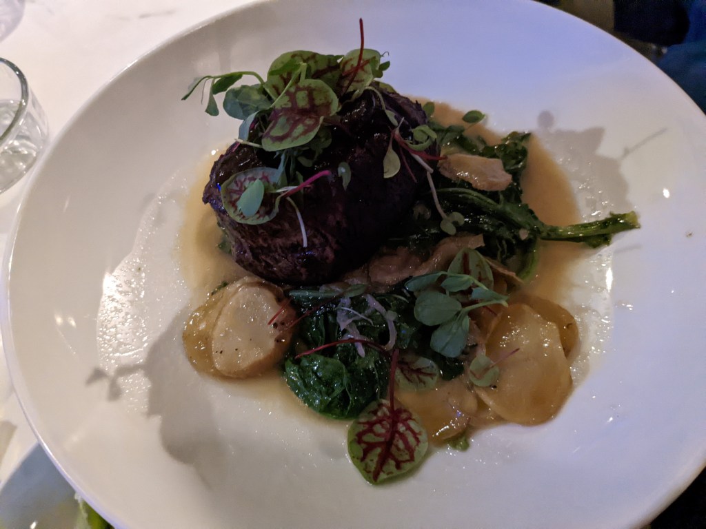 We tried the Bison steak at the nearby Osteria restaurant. Bison tasted like beef with a subtle sweet flavor.