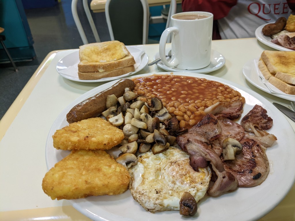 We like having a big English breakfast at a local cafe. That was what we got in the morning.