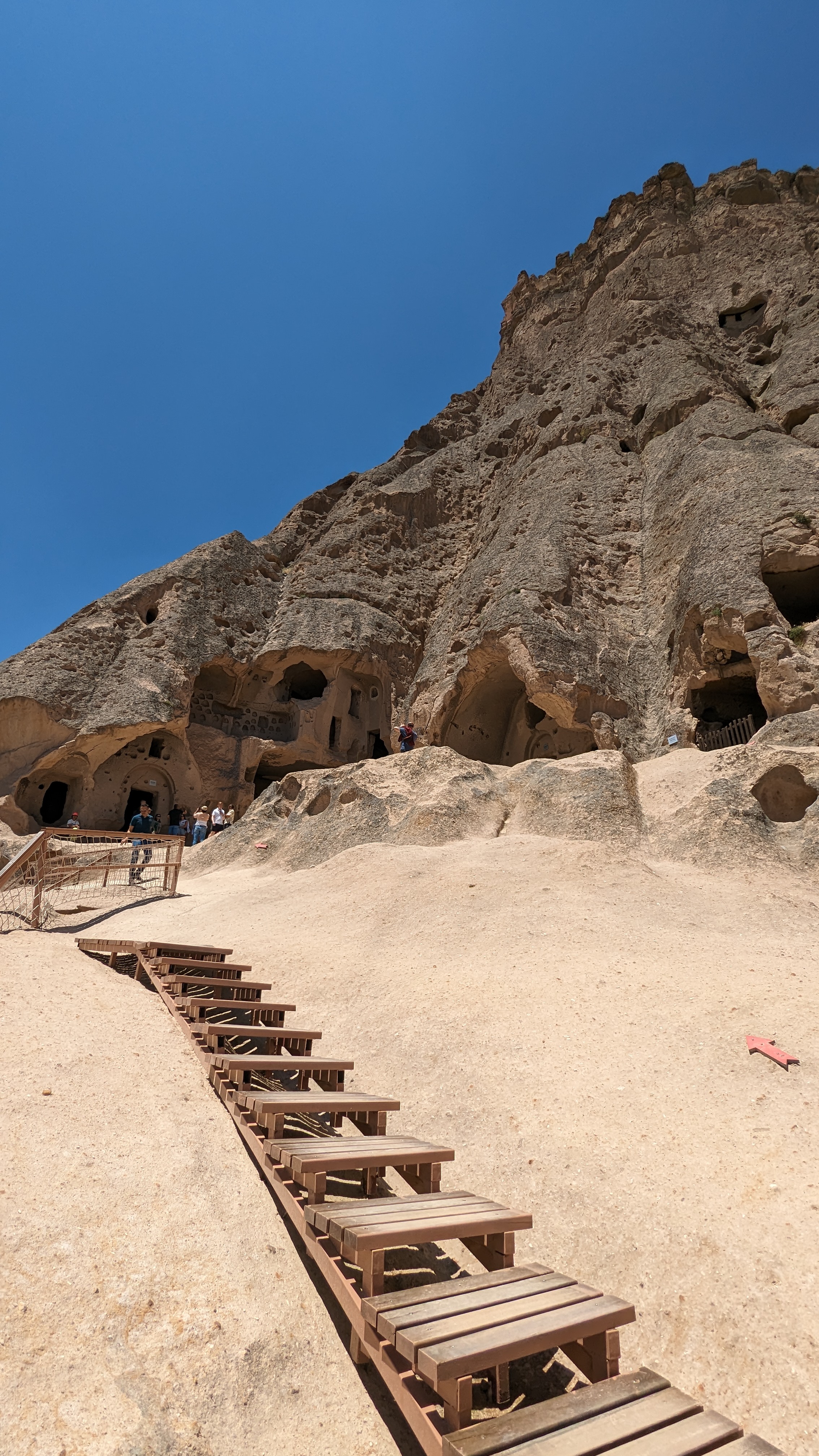To reach our room at the cave hotel, we had to climb many steps. We were never tired of the breathtaking view of the jagged landscape and other cave dwellings along the way. The area was a bit dusty for our sensitive noses. We took it as a feature of this rugged landscape. The cave room was a spacious and clean environment adorned with beautiful kilims, adding a touch of local culture. The cave hotel ingeniously combined the unique cave structure with modern hotel amenities, with cave walls surrounding us and shower areas without a traditional door.
