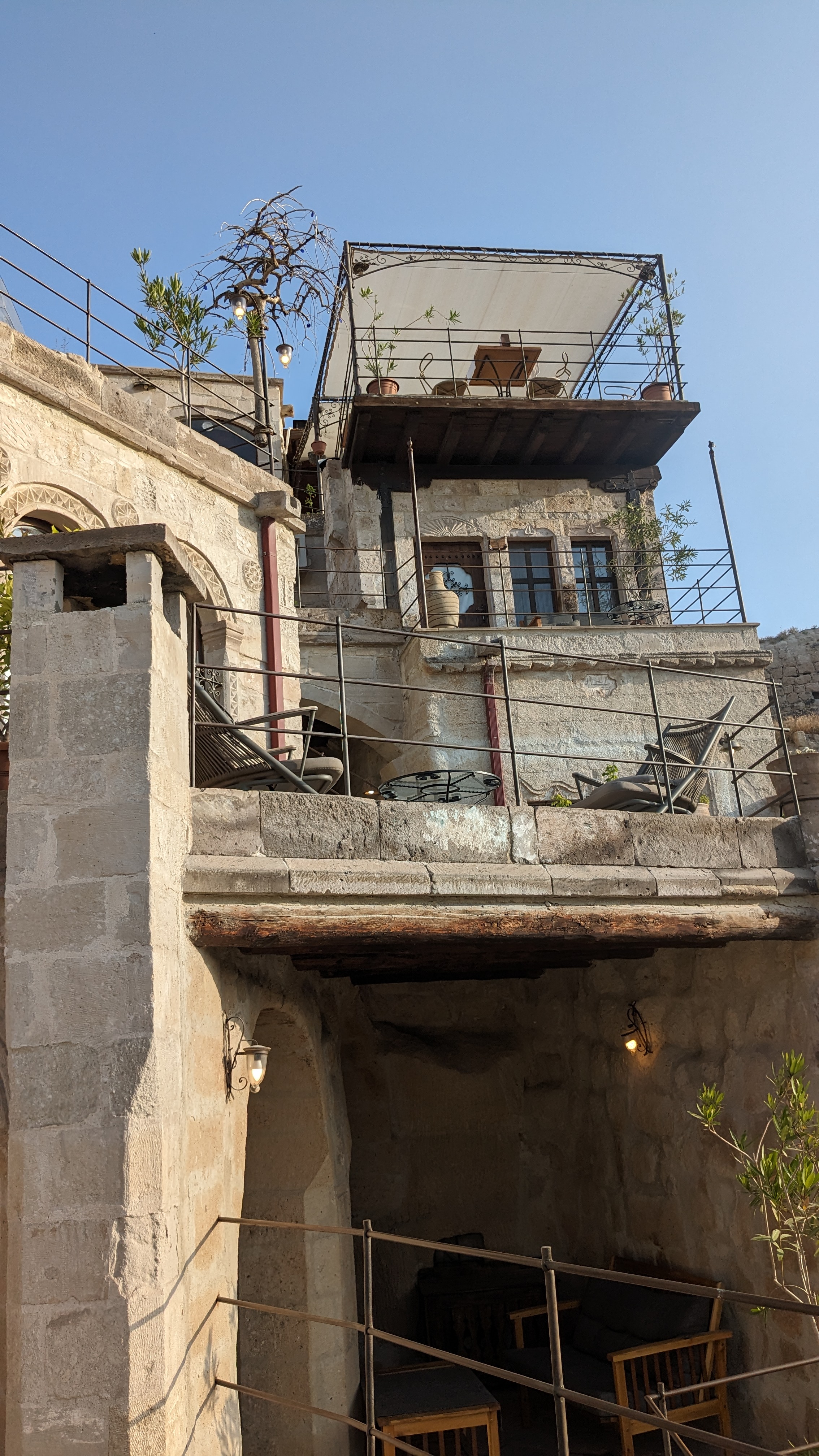 To reach our room at the cave hotel, we had to climb many steps. We were never tired of the breathtaking view of the jagged landscape and other cave dwellings along the way. The area was a bit dusty for our sensitive noses. We took it as a feature of this rugged landscape. The cave room was a spacious and clean environment adorned with beautiful kilims, adding a touch of local culture. The cave hotel ingeniously combined the unique cave structure with modern hotel amenities, with cave walls surrounding us and shower areas without a traditional door.